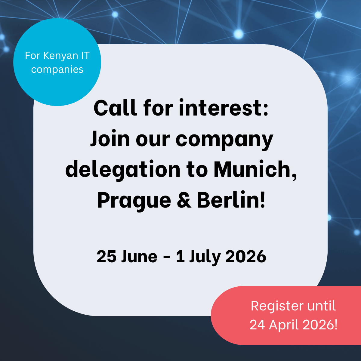 25 June - 1 July 2026, Germany The Digital Transformation Centre Kenya, in collaboration with the Kenyan-German Digital Dialogue, is inviting Kenyan IT companies to express interest in a business delegation to Europe focused on IT-enabled services. A highlight will be the visit of GITEX AI Europe.